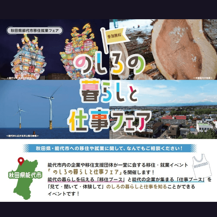 能代市内の企業や移住支援団体が一堂に会する移住・就業イベント「のしろの暮らしと仕事フェア」を開催します!